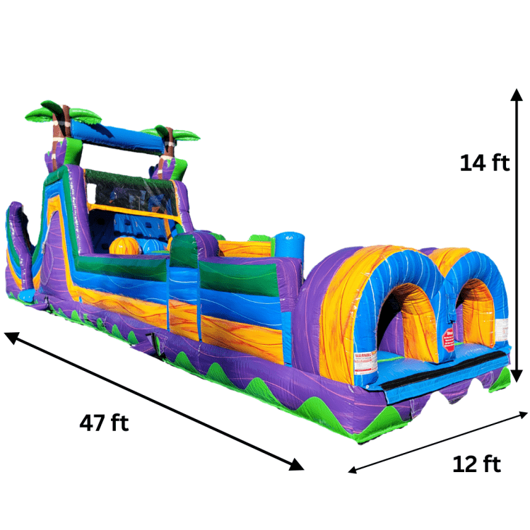 Radical Rampage is a bold, high-energy inflatable obstacle course built for nonstop action and big fun. It features a long, colorful layout with eye-catching tropical styling, multiple crawl-through openings, raised play areas, climbing sections, and a steep slide that adds a fast, exciting finish. The front entry includes twin tunnel-style openings, while the main course stretches out with padded obstacles and open lane space that keeps participants moving from one challenge to the next. Bright purple, blue, green, and orange details make it stand out right away, and the palm tree accents give it a playful, island-inspired look. This rental is a great choice for parties, school events, field days, church gatherings, and backyard celebrations when you want something that feels exciting, active, and larger than life.