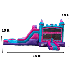 Jump in to this bright dual lane bounce house/slide combo. It can be used dry most of the year but those couple magical summer months a hose can be hooked up to it to turn it into a thrilling water slide.